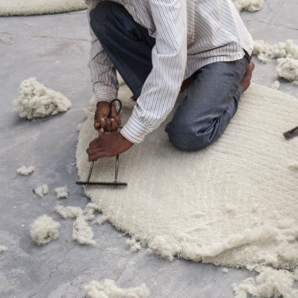 Once weaving is done, skilled craftsmen trim the pile and refine the design outlines using sharp shears. This brings out the patterns and textures beautifully.