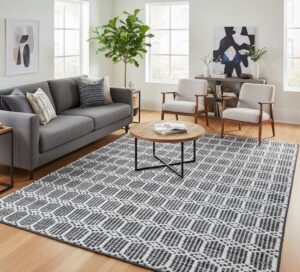 This contemporary flatweave rug combines simplicity and sophistication with its grey and white geometric design. Ideal for modern homes, it enhances any space with subtle texture and warmth while remaining practical, durable, and easy to style with various décor themes.